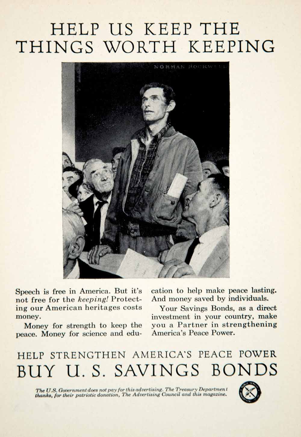 1958 Ad US Savings Bonds Norman Rockwell Art Freedom Speech Treasury YSFC3