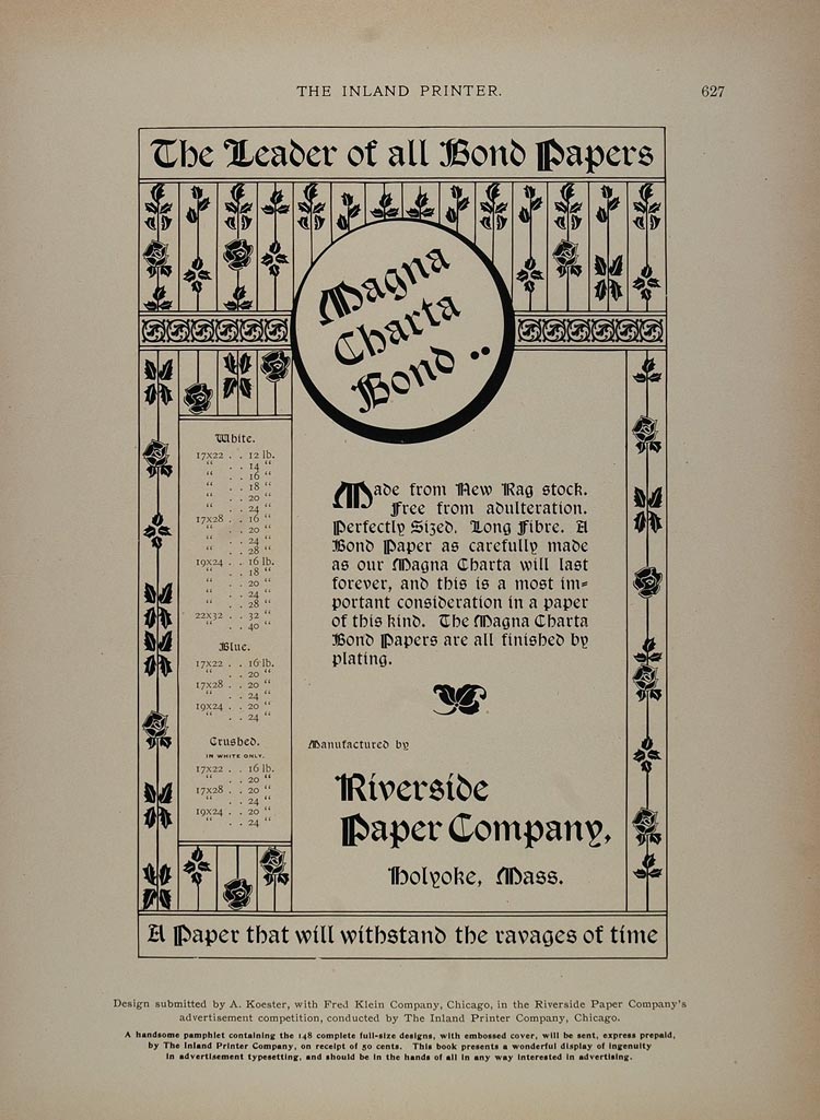 1897 Ad Riverside Paper Company Holyoke A. Koester - ORIGINAL ADVERTISING IP1