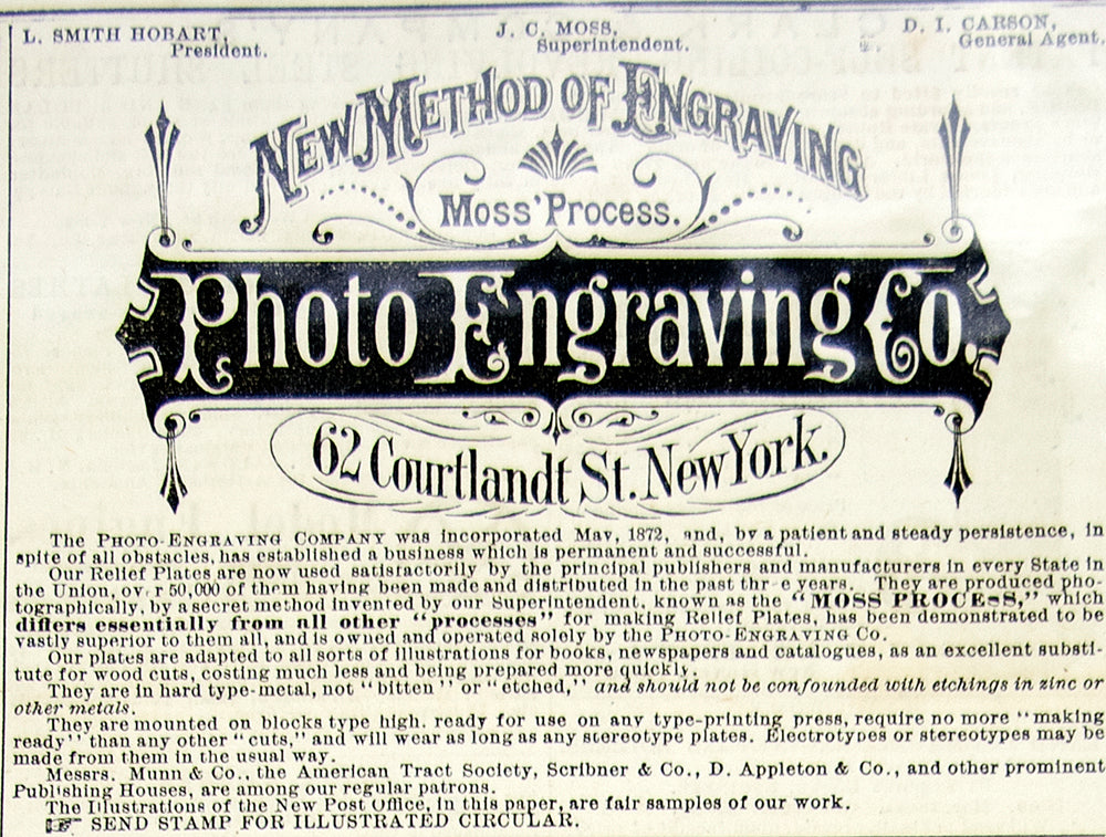 1875 Ad Moss Process Photo Engraving Co. 62 Courtland Street NYC Printing YSA4