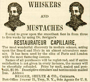 This is an original 1865 black and white print ad for Berger, Schultz & Company, featuring their product developed by Dr. Sevigne called Restaurateur Capillaire. Anyone desiring a hairy manly face could supposedly achieve it within three to five weeks of using this product.