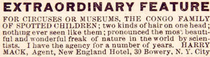 This is a tiny, original 1886 black and white booking ad for the Congo Family of Spotted Children: two kinds of hair on one head; nothing ever seen like them; pronounced the most beautiful and wonderful freak of nature by scientists. Harry Mack, Agent, New England Hotel, 30 Bowery, NYC.