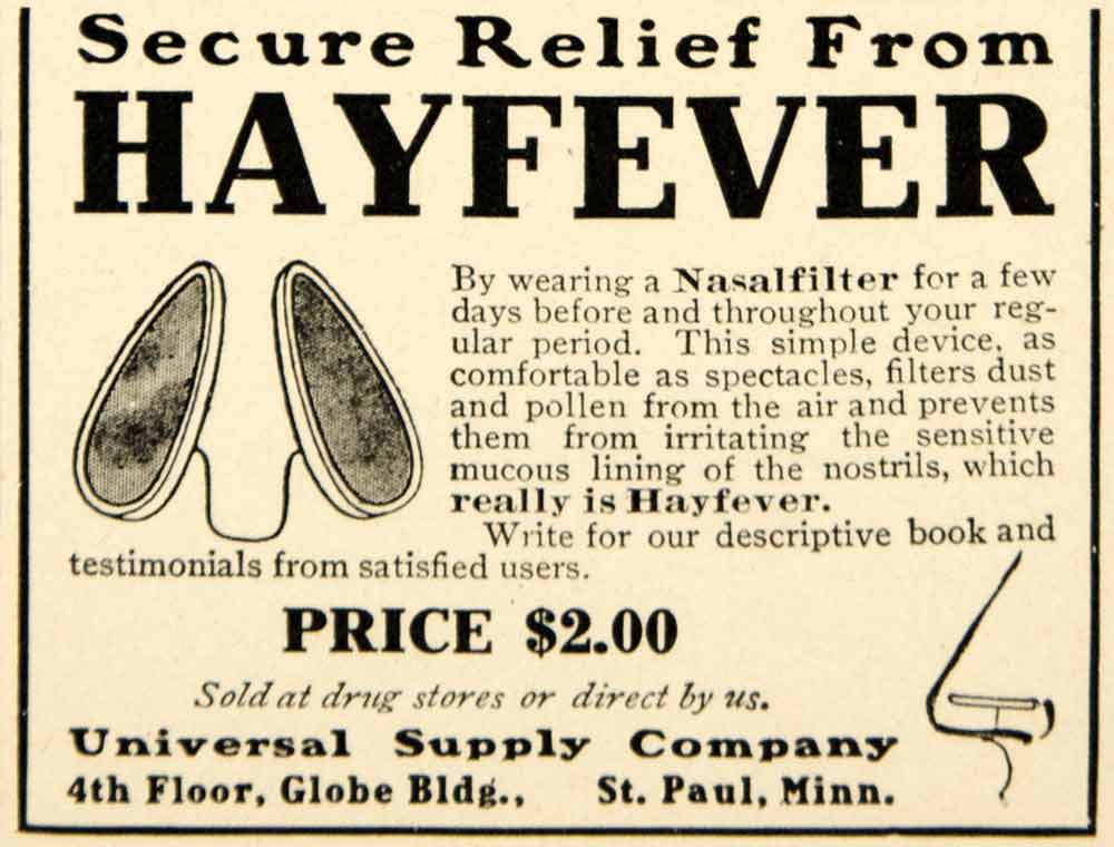 This is an original 1909 black and white print ad for Nasalfilters, medical devices "as comfortable as spectacles" that "filtered dust and pollen from the air" and "prevented them from irritating the sensitive mucous lining of the nostrils". Nasalfilters were made and sold by the Universal Supply Company of St. Paul, Minnesota (MN) during the Edwardian era.