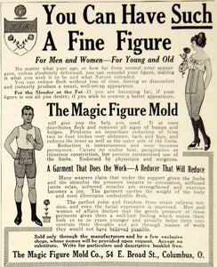 This is an original 1915 black and white print ad for the "magic" figure mold undergarment for men and women that "eliminates undesirable flesh".
