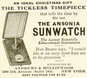 This is an original 1921 black and white print ad for the Ansonia Sunwatch timepiece that was sold by Andrews & Hollinwood of 500 Fifth Avenue, New York, NY. The ad also featured a testimonial from Dan Beard.