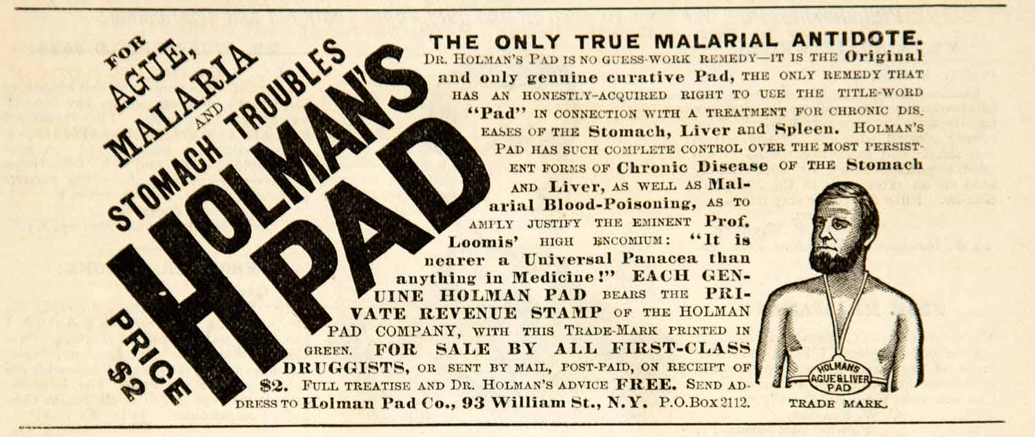This is an original 1922 black and white print ad for Holman's curative pad that was the "only" remedy for ague, malaria, and other stomach ailments. The pads were made by the Holman Pad Company of 93 William Street, New York, NY.