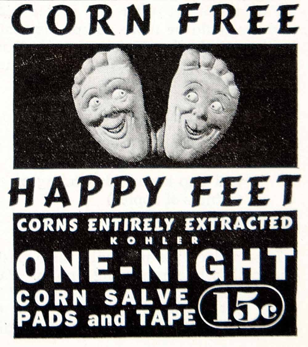 1939 Ad Vintage Kohler One-Night Corn Salve Pads Removal Happy Feet Foot YHS1