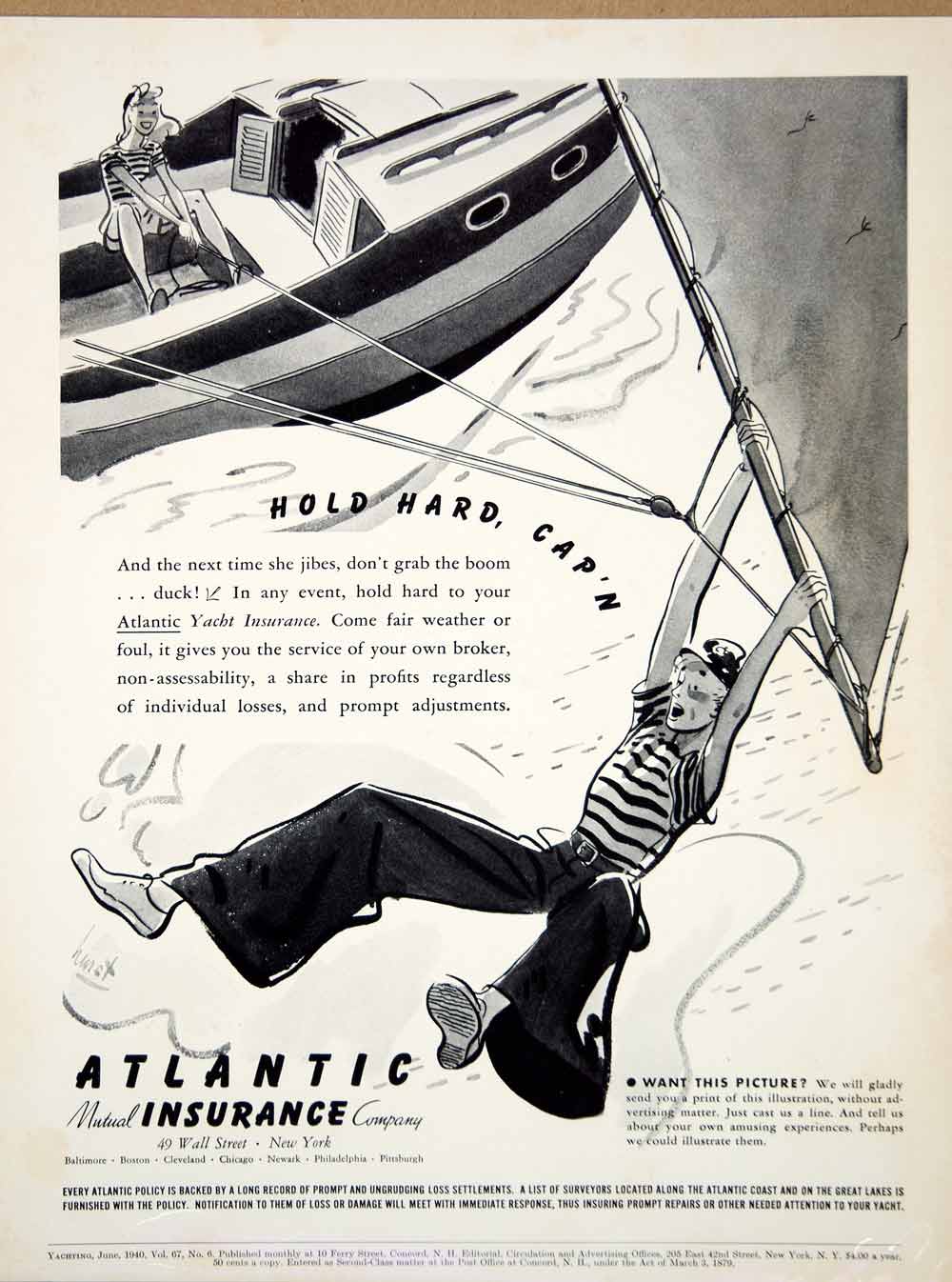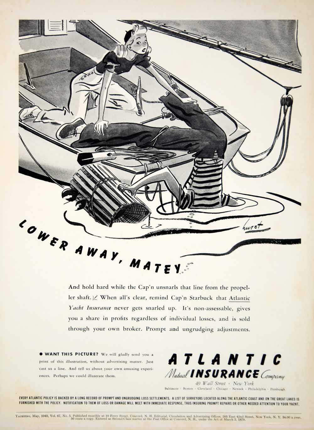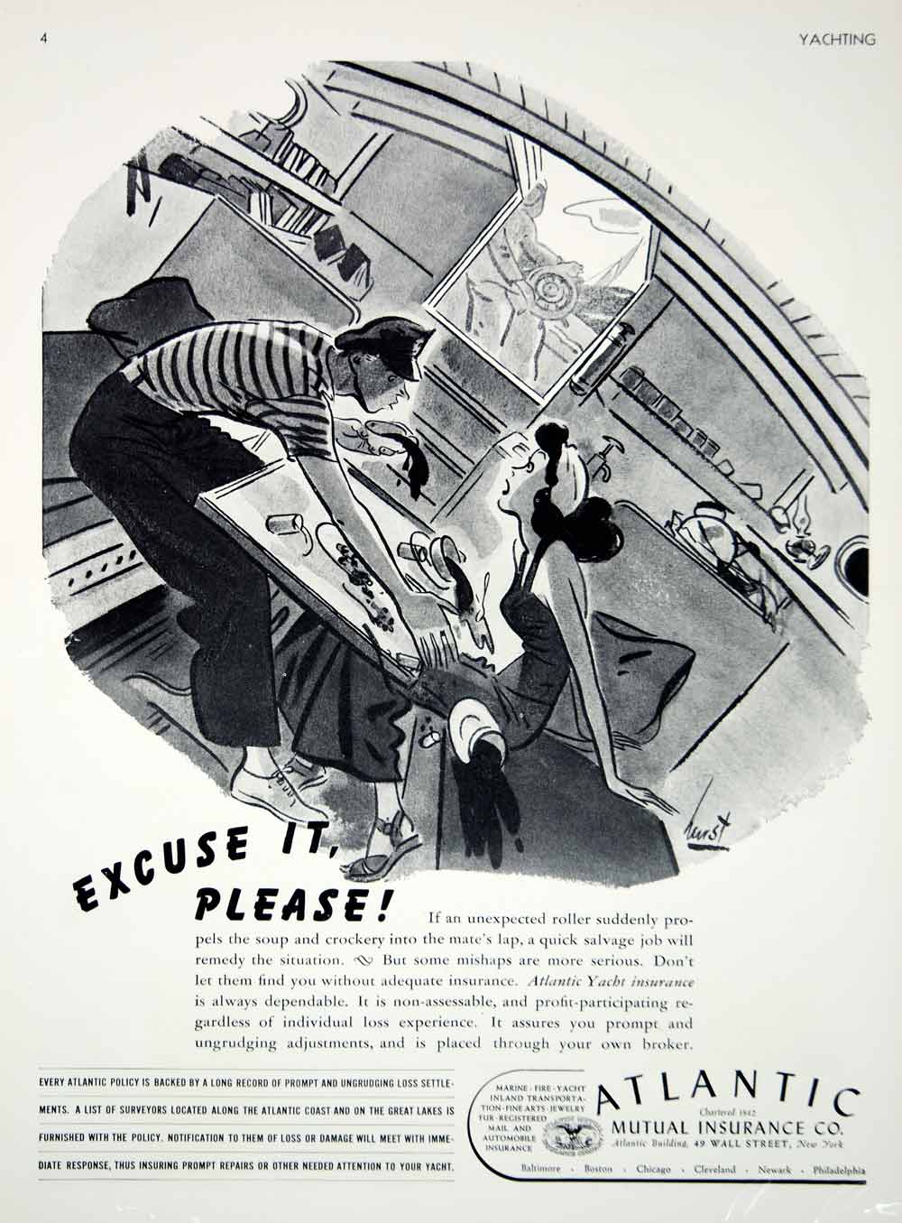 1940 Ad Atlantic Mutual Insurance Yacht Boat Policy Earl Oliver Hurst Cartoon
