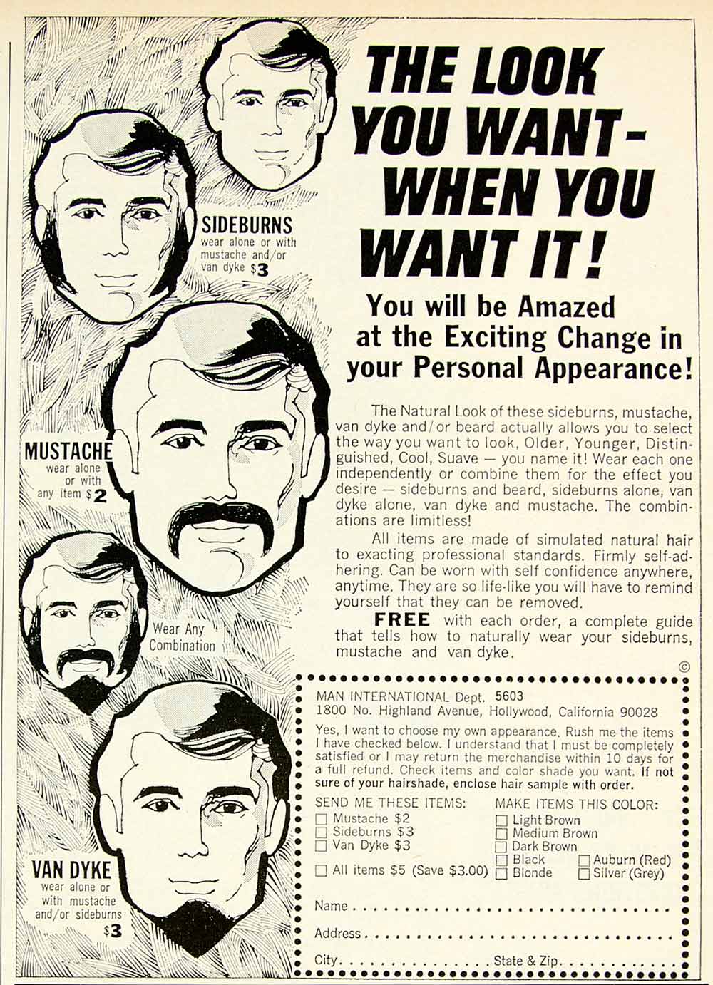 1968 Ad Vintage Fake Beard Mustache Sideburns Men Hairpiece Costume UNUSUAL YHR3