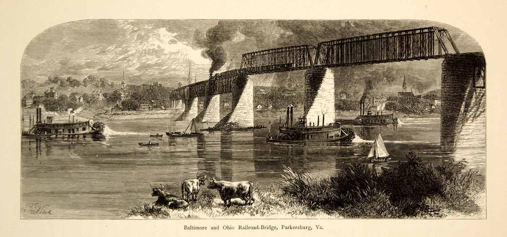 1873 Wood Engraving Parkersburg VA Baltimore & Ohio Railroad Bridge River YPA2