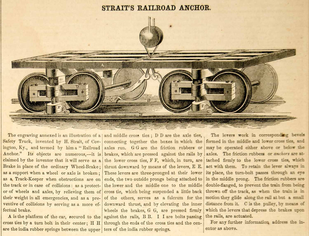 1853 Wood Engraving Railroad Safety Truck Anchor Brake Train Track Railway YSA2