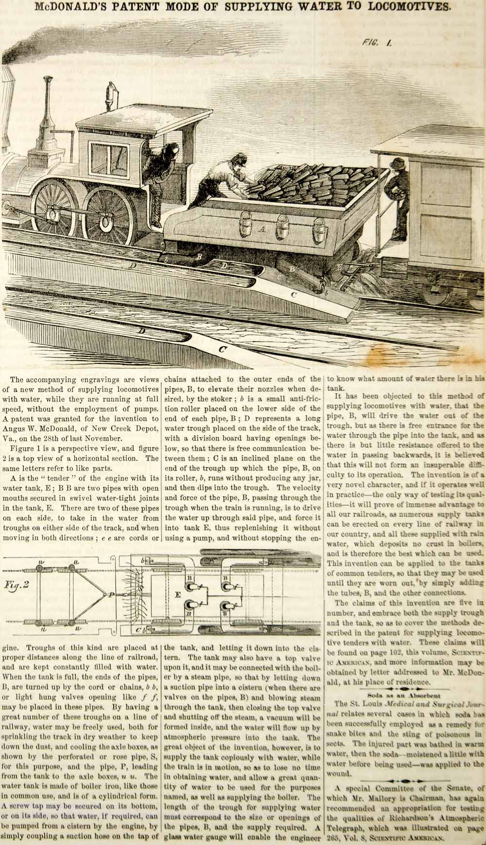 1855 Wood Engraving Antique Steam Train Locomotive Water Supply Tank Tender YSA2