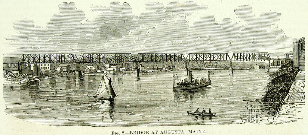 1873 Wood Engraving Railroad Bridge Kennebec River Augusta ME Clarke Reeves YSA3