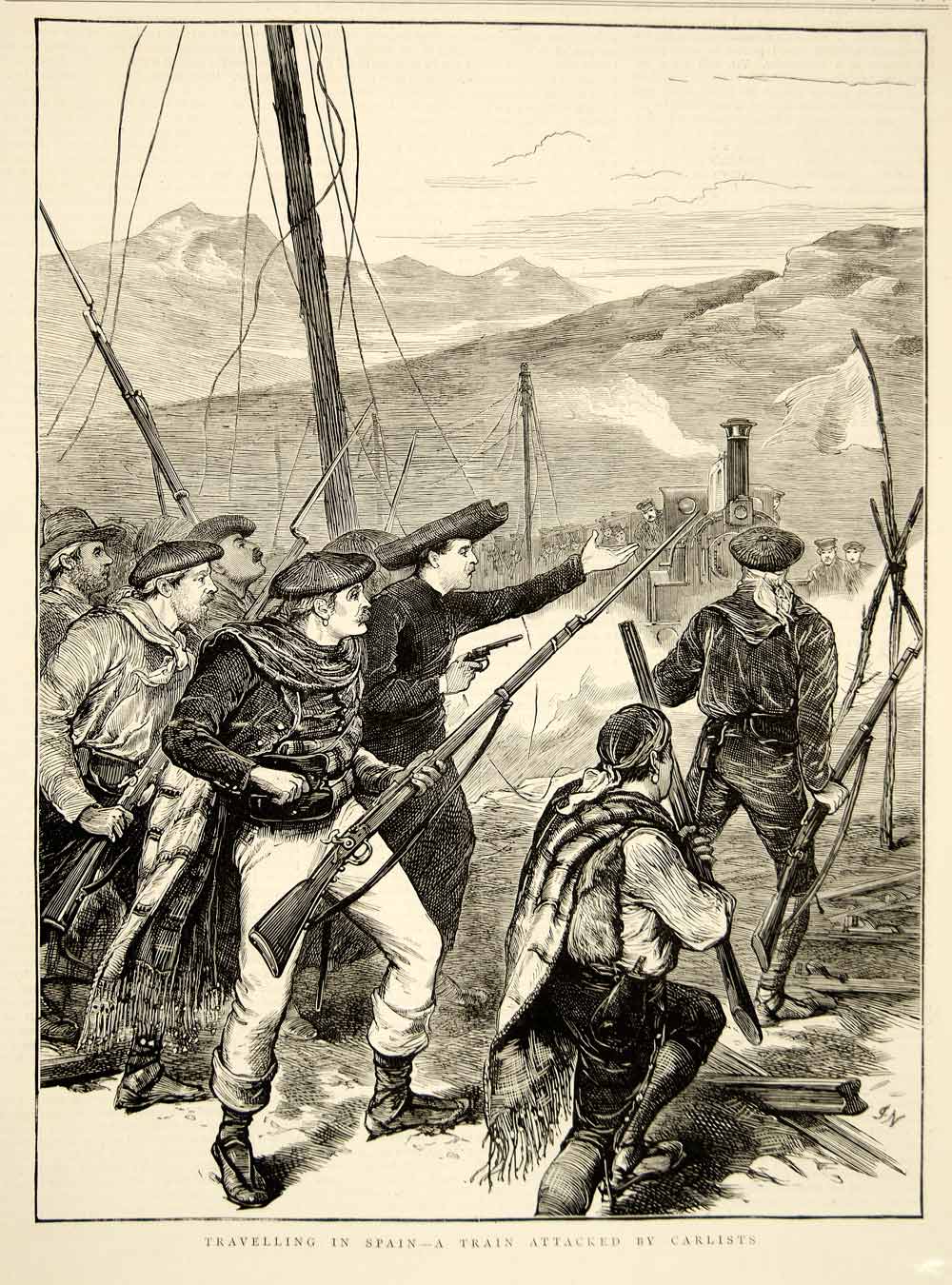 1873 Wood Engraving Art Third Carlist War Madrid Alicante Railway Spain YTG5