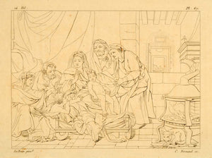 This is an original 1807 black and white copper line engraving of a painting by the French painter, Charles Le Brun, of the Holy Family. Engraved by Charles-Pierre-Joseph Normand (1765-1840).