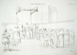 This is an original 1834 black and white copper engraving of the Pope seated on his throne with various members of the clergy before him, circa the 14th - 15th century.