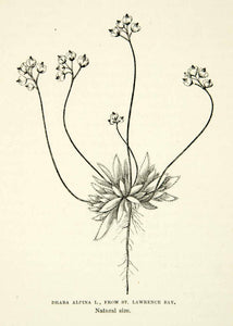 This is an original 1882 black and white in-text wood engraving of the Draba alpina L. flower that is native to St. Lawrence Bay region.