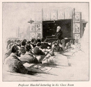 This is an original 1902 black and white halftone print of Ernst Haeckel lecturing in his class room. Haeckel was a German biologist that named many species and made left a great mark in the world of science.