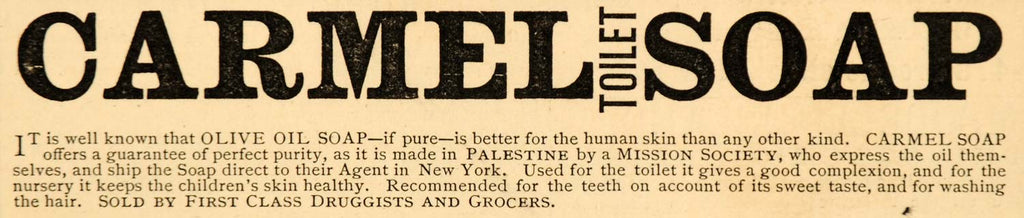 1885 Ad Carmel Toilet Soap Olive Oil Skin Teeth Hair NY - ORIGINAL LF2