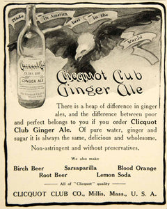 This is an original 1909 black and white print ad for ginger ale soft drinks that were made and sold by the Clicquot Club Co., of Millis, Massachusetts (MA).