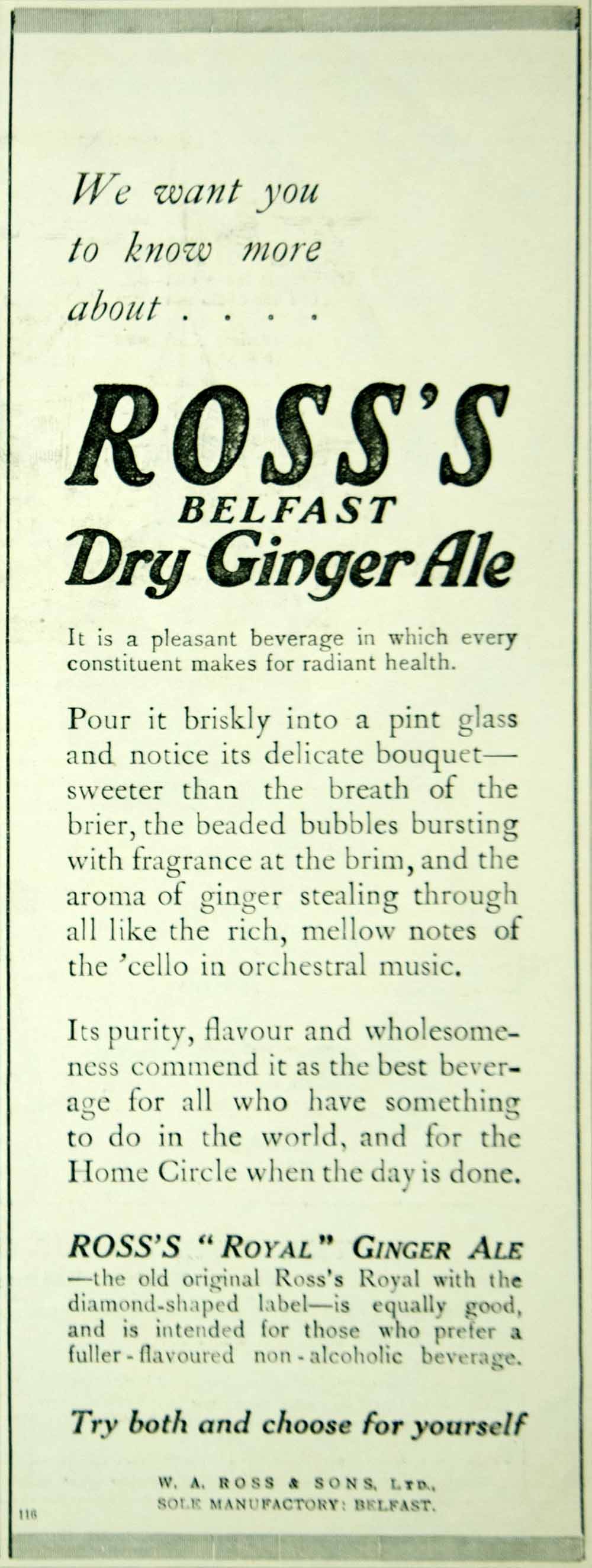 This is an original 1915 World War I era black and white print ad for Ross's Belfast Dry Ginger Ale and Ross's Royal Ginger Ale from W. A. Ross & Sons, Ltd. Belfast, Northern Ireland.