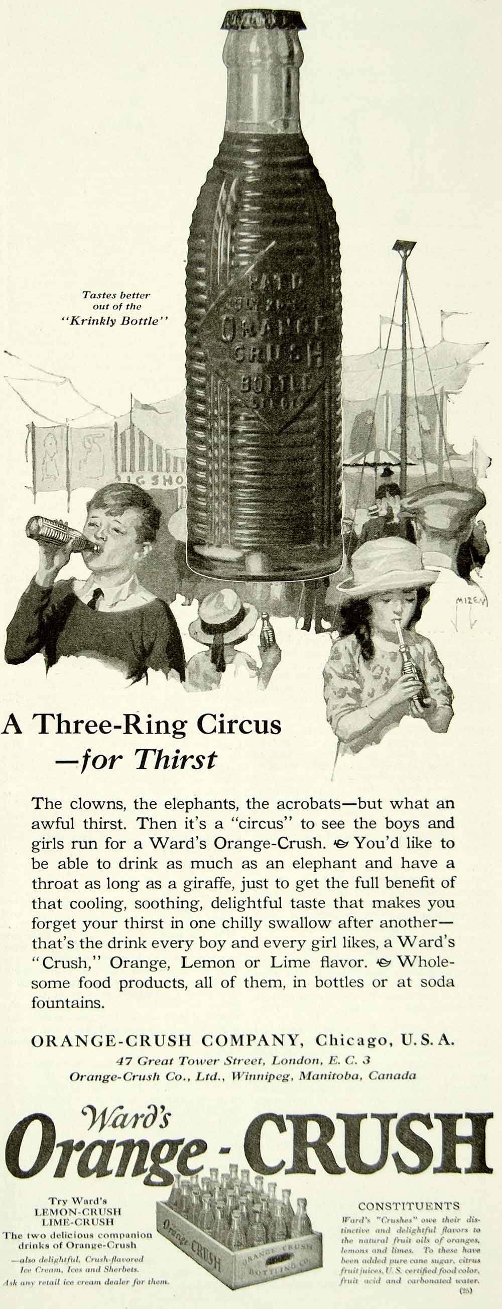 This is an original 1923 black and white print ad for Ward's orange-crush, lemon-crush, and lime-crush flavored soft drinks that were made and sold by the Orange-Crush Company of Chicago, Illinois (IL) and 47 Great Tower Street, London, England (UK). The ad also featured an illustration by Frederic Kimball Mizen.