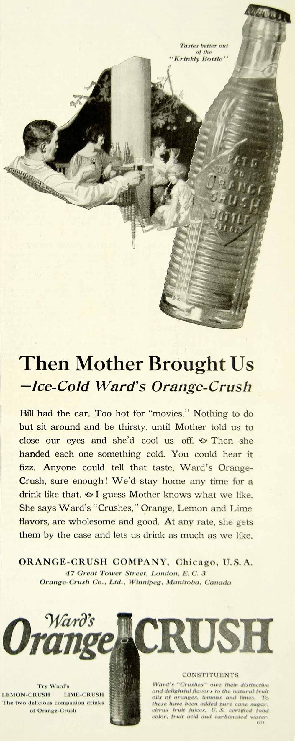 This is an original 1923 black and white print ad for Ward's orange-crush, lemon-crush, and lime-crush flavored soft drinks that were made and sold by the Orange-Crush Company of Chicago, Illinois (IL) and 47 Great Tower Street, London, England (UK). The ad also featured an illustration by Frederic Kimball Mizen.