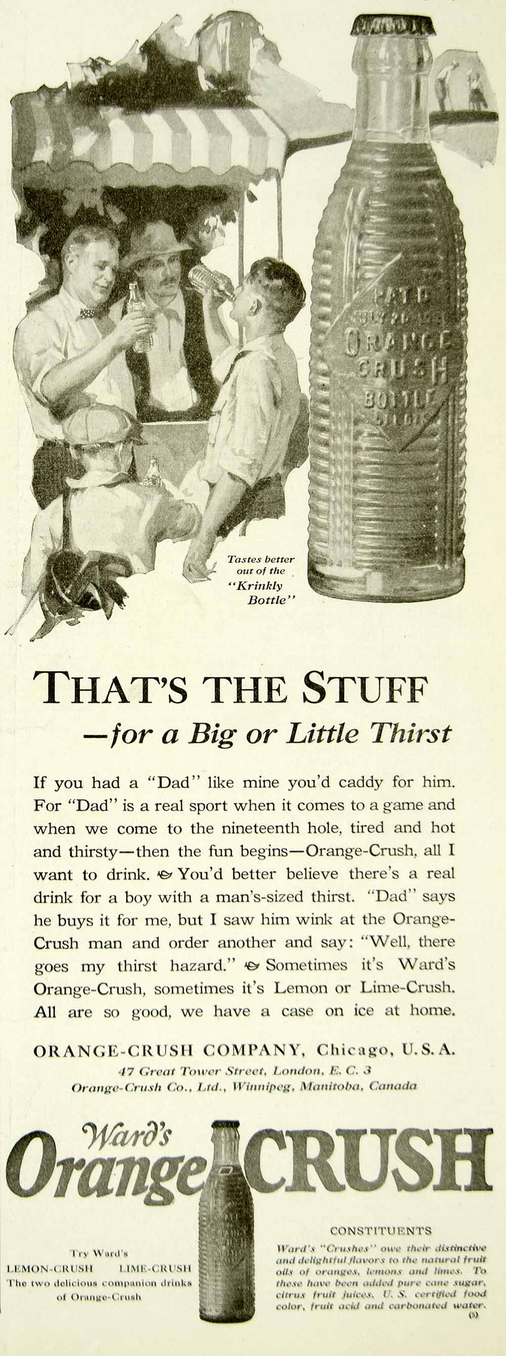 This is an original 1923 black and white print ad for Ward's orange-crush, lemon-crush, and lime-crush flavored soft drinks that were made and sold by the Orange-Crush Company of Chicago, Illinois (IL) and 47 Great Tower Street, London, England (UK).