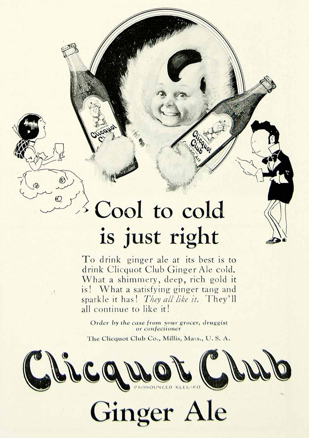 This is an original 1924 black and white print ad for Ginger Ale flavored beverages that were made and sold by the Clicquot Club Company.