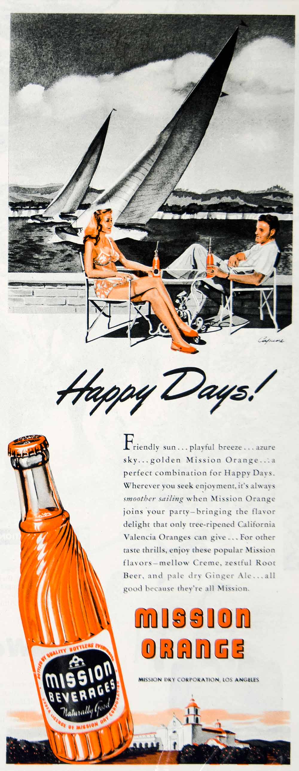This is an original 1947 black and white with color print ad for Mission Orange soft drinks that features an illustration by William Conrad Capune.
