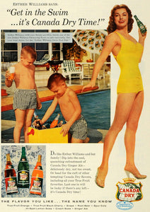 This is an original 1956 color print ad promoting the Canada Dry Ginger Ale, Canada Dry Black Cherry, and Canada Dry Orange from Canada Dry. This ad also features an image of Esther Williams and her sons Benjie and Kim, beside one of the Esther Williams Swimming Pools.