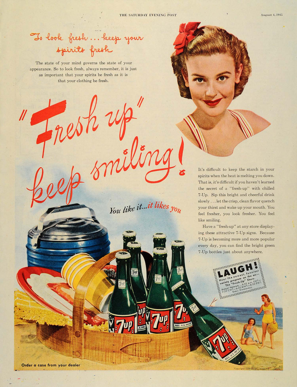 1945 Ad 7-UP Seven-Up Beach Green Glass Bottles WWII - ORIGINAL ADVERTISING SEP3