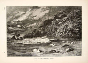 This is an original 1875 black and white wood engraving of a "Puff of wind on the Ucayali River" in South America. Because of course a nice, tropical, gentle breeze would have blown all of those birds "beakdown" in the sandy shore. Kudos to the to the illustrator who drew so nicely in such inclement weather.