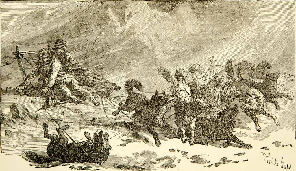 1873 Wood Engraving Sled Dog Team Sled Landscape Mountain Snow North Pole XGXC4