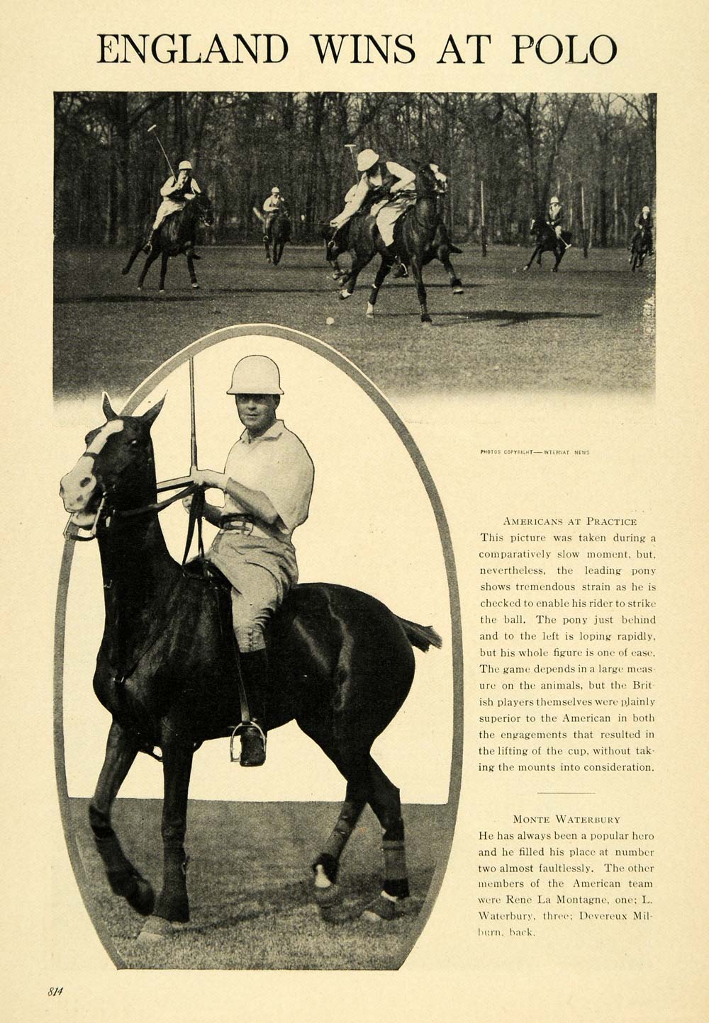 1914 Print American British Polo Game Monte Waterbury - ORIGINAL HISTORIC TW3