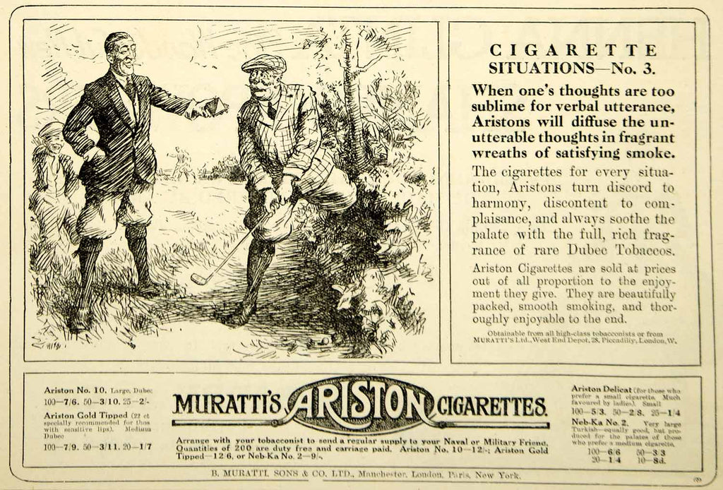 1916 Ad Vintage Muratti's Ariston Cigarettes British Smoking Golfers Golf Advert