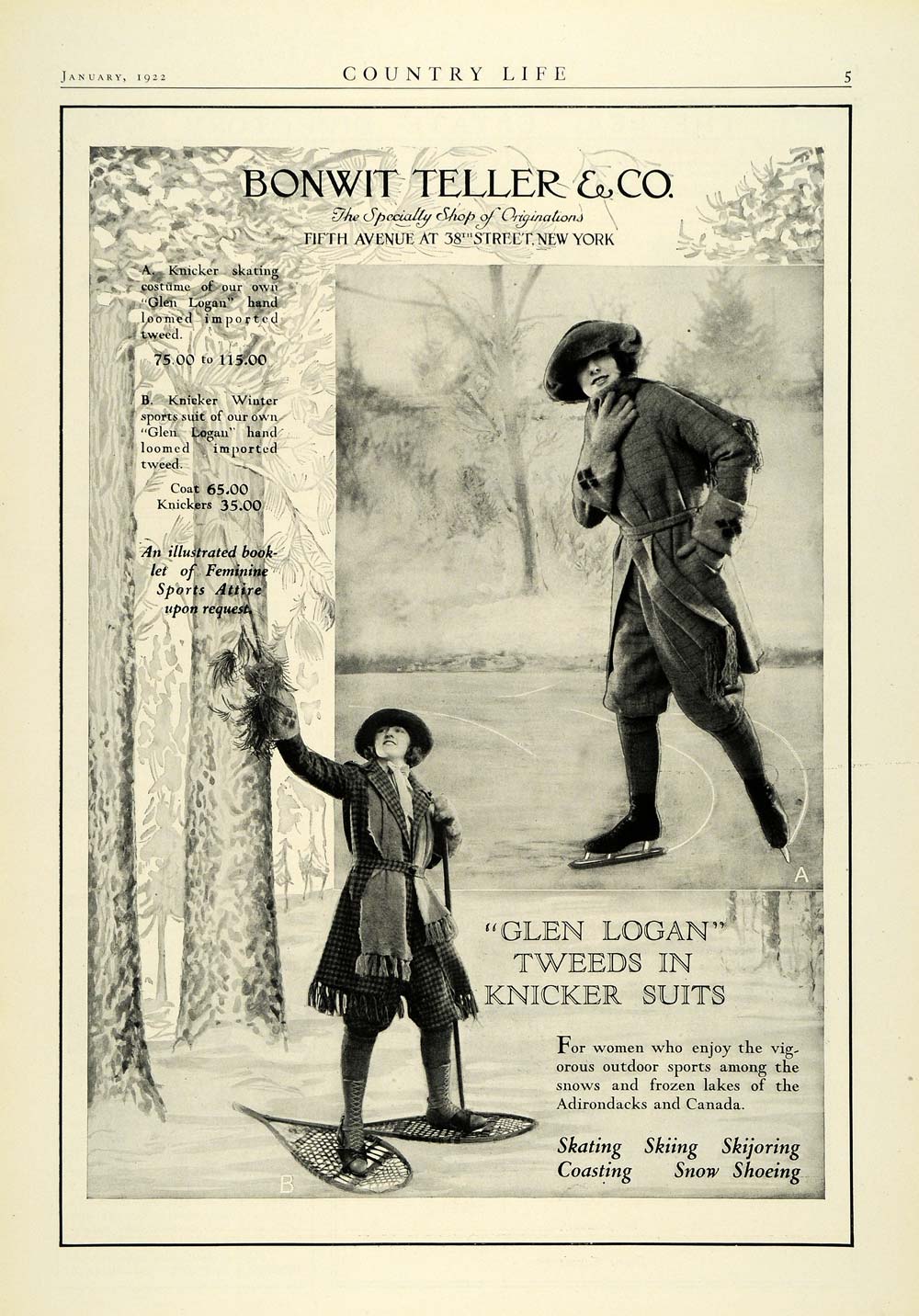 1922 Ad Bonwit Teller Glen Logan Tweeds Knicker Suits Snow Shoeing Ice COL2