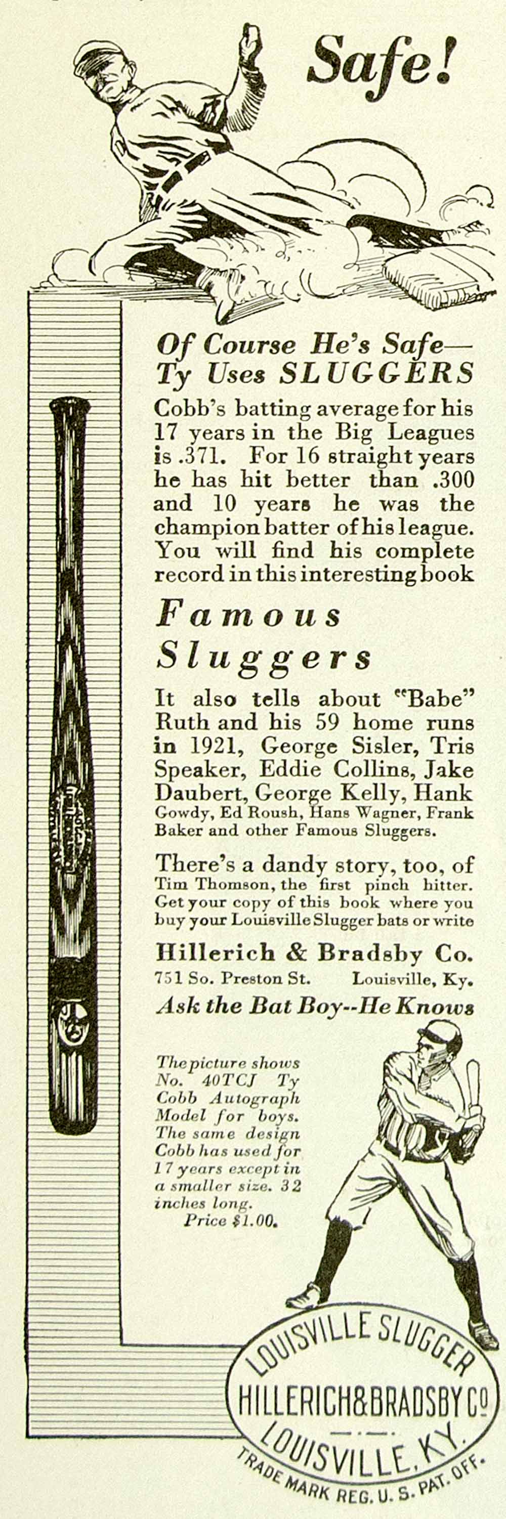 1922 Ad Hillerich Bradsby Louisville Slugger Ty Cobb Baseball Bat Sporting YYC3