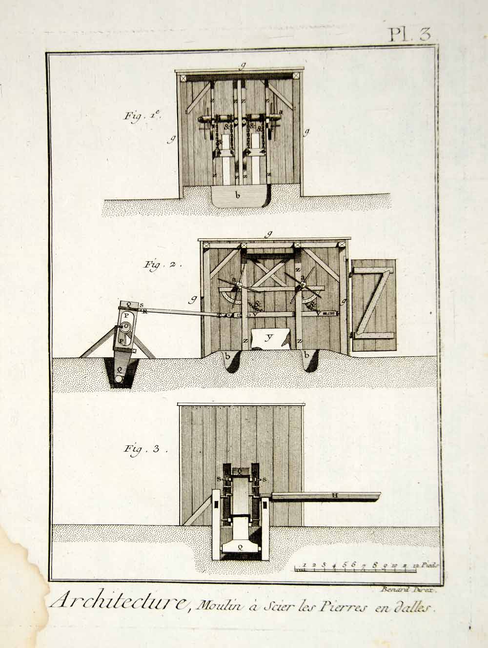 1779 Copper Engraving Windmill Stonecutting Parts Interior Antique Diderot DDR2