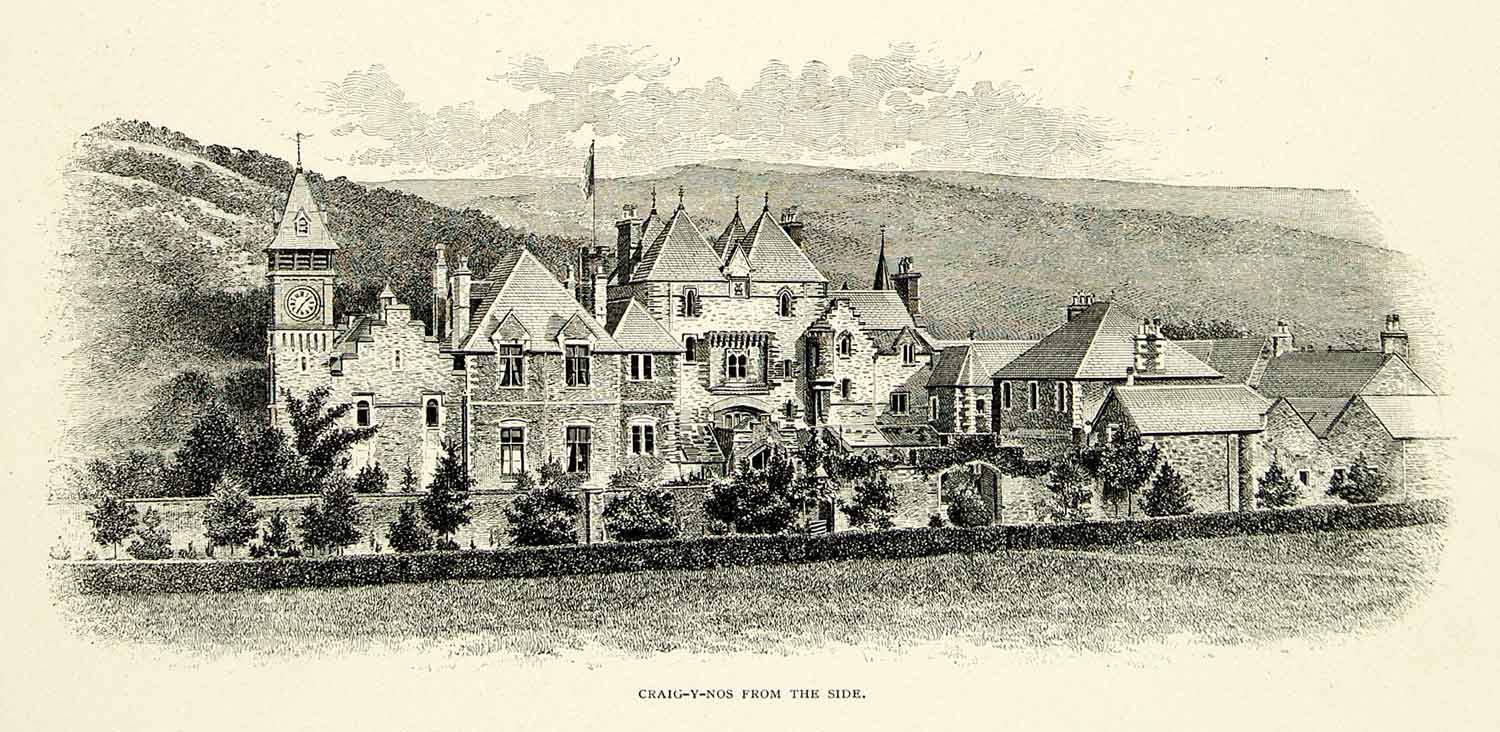 This is an original 1895 black and white relief line-block print of Craig-y-Nos Castle in Wales, the former estate of opera singer Adelina Patti.