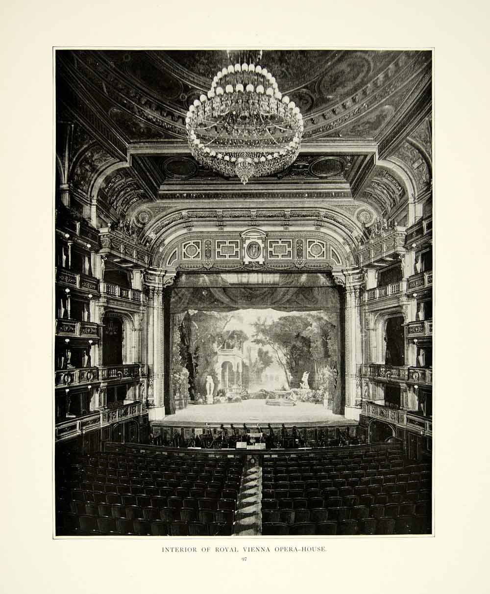 This is an original 1895 black and white halftone print that depicts the interior of Royal Vienna Opera-House in Austria.
