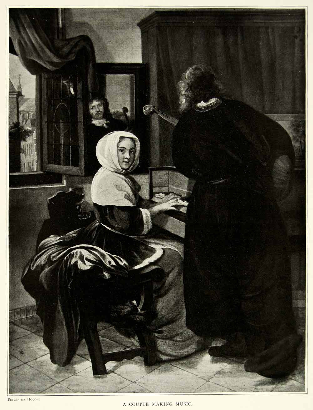 This is an original 1895 black and white halftone print entitled "A Couple Making Music," by Pieter de Hoch.