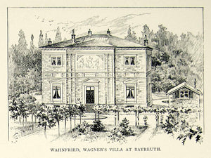 This is an original 1895 black and white relief line-block print that depicts Wahnfried, Wagner's Villa at Bayreuth.