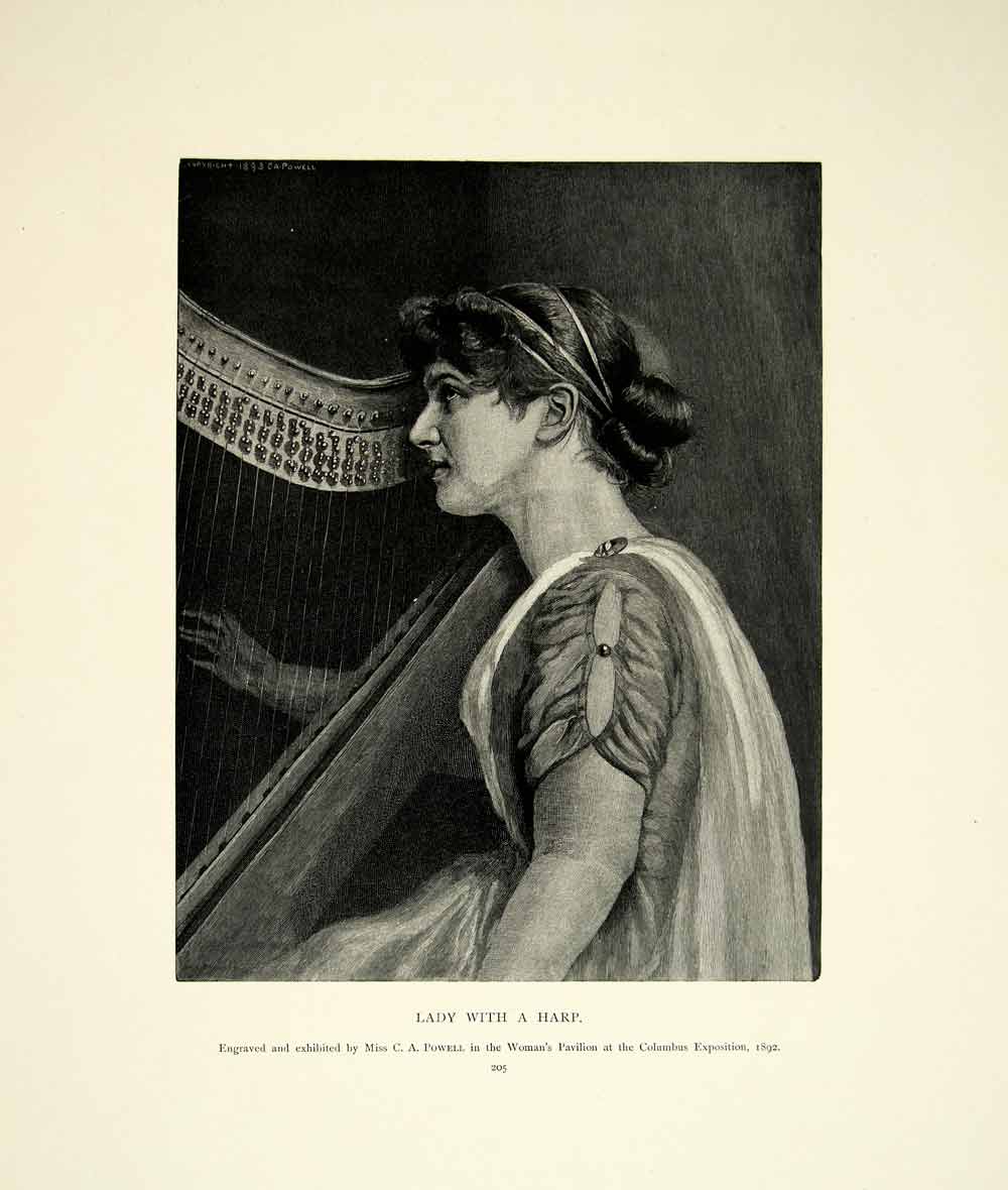 This is an original 1895 black and white in-text wood engraving entitled "Lady with a Harp," by C.A. Powell. This image was exhibited in the Woman's Pavilion at the Columbus Exposition, 1892.