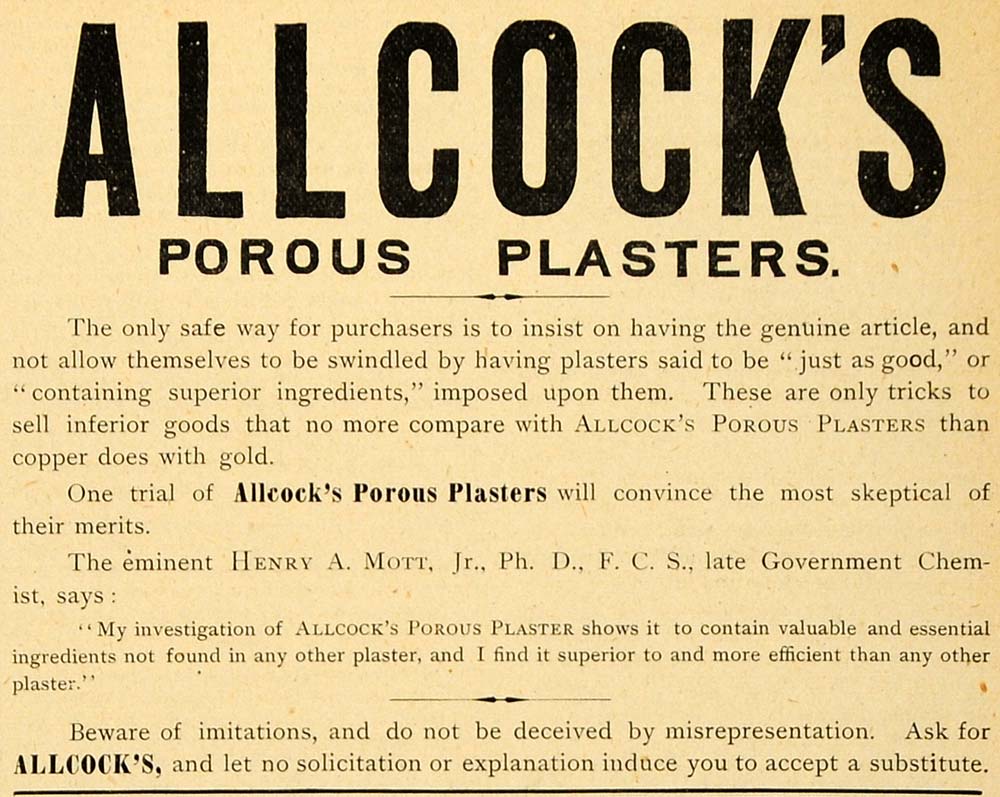 1890 Ad Allcock's Porous Plaster Henry A Mott Jr Government Chemist AAG1