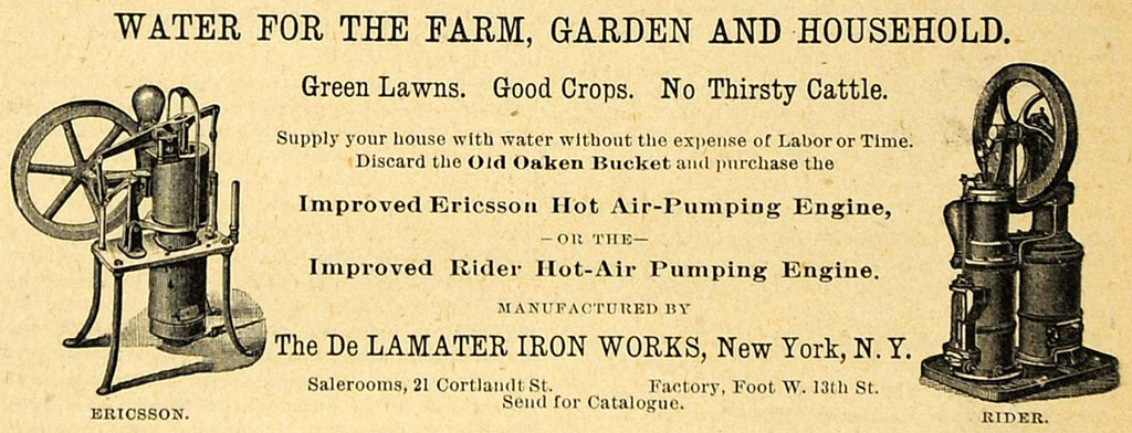 1892 Ad De Lamater Iron Ericsson Hot Air Pumping Engine Farm Garden Home AAG1