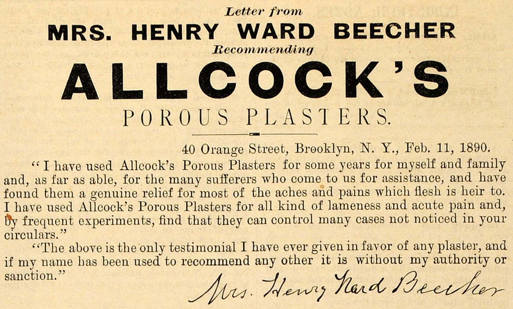 1890 Ad Allcock's Porous Plaster Mrs Henry Ward Beecher - ORIGINAL AAG1