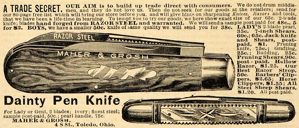 1890 Ad Dainty Pen Knife Maher Grosh Razor Steel Pruning Shears Clippers AAG1