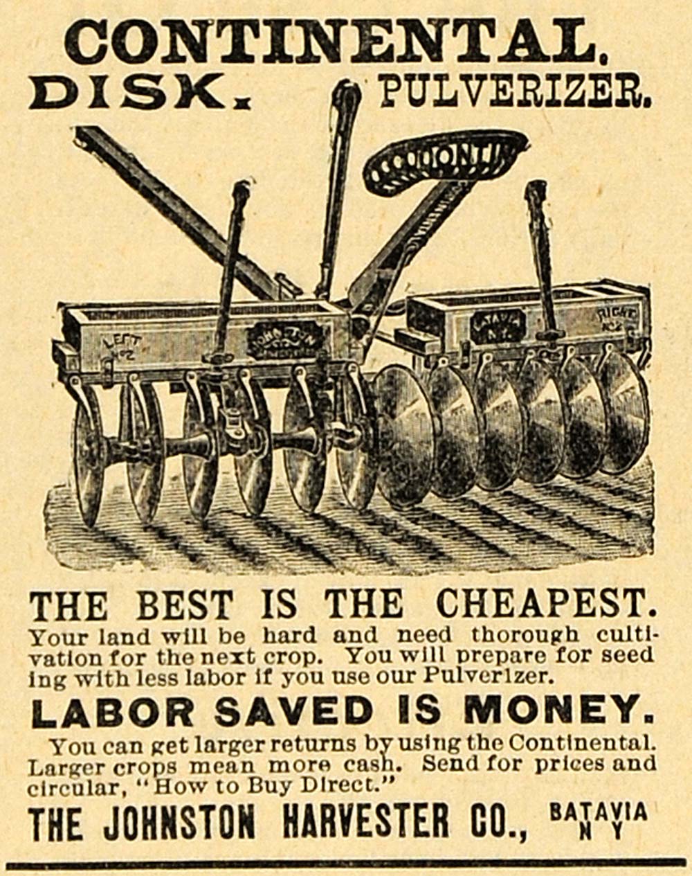1890 Ad Johnston Harvester Continental Disk Pulverizer Agriculture AAG1