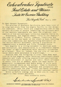 This is an original 1903 black and white print ad encouraging travel, tourism and residency in Los Angeles, California, featuring a testimonial letter from Erkenbrecher Syndicate Real Estate and Mines.