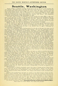 This is a rare original 1903 black and white print ad encouraging travel, tourism and residency in Seattle, Washington. This ad was sponsored by the Secretary Chamber of Commerce in Seattle.